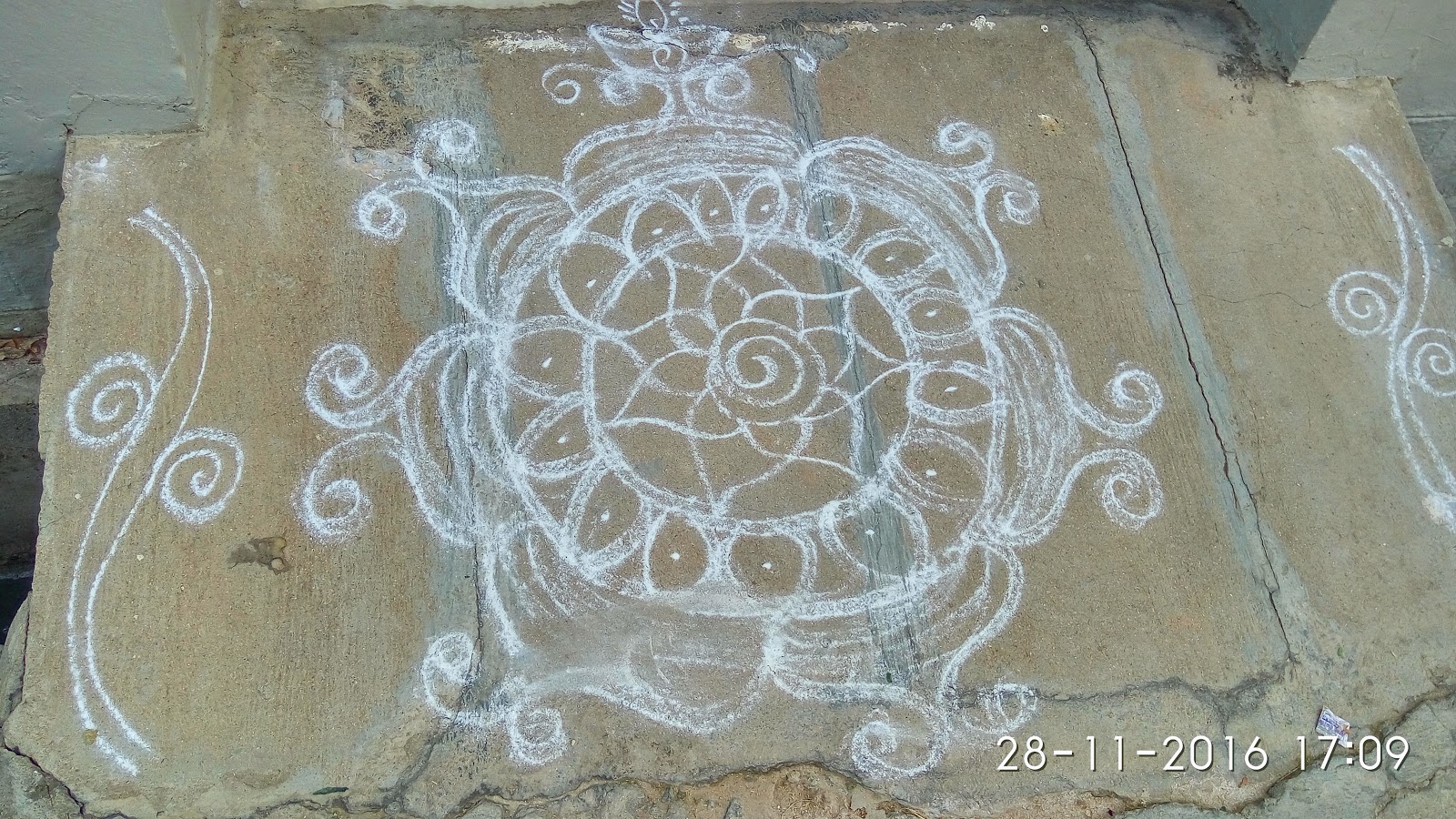 después una siesta, que hace un calor abrasador para salir y más para el atardecer me voy a dar una vuelta a ver el templo. Por el camino me encuentro que en las casas, en el suelo, en frente la entrada, pintan mandalas… este para ti Olga, jejej